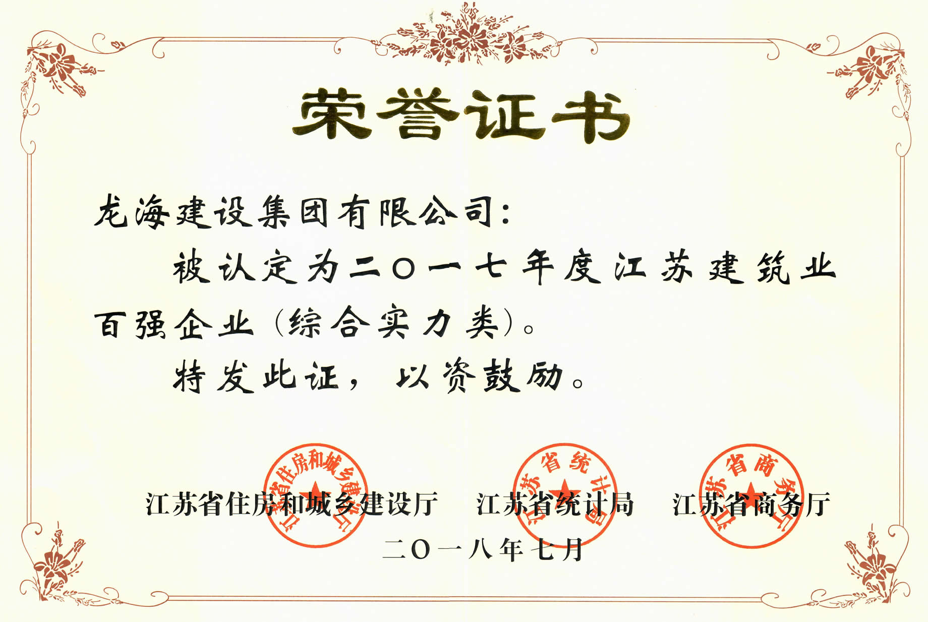 為充分發揮優勢骨干企業在全行業中的示范引領作用,打造企業品牌形象,省住房城鄉建設廳、統計局、商務廳成立了“百強企業”認定委員會,并按照有關程序,組織開展了2017年度建筑業“百強企業”認定活動。經評審,集團公司脫穎而出,被授予“2017年度江蘇省建筑業百強企業(綜合實力類)”榮譽稱號,位列第二十二。按照《江蘇省建筑業企業信用綜合評價辦法》(蘇建建管〔2016〕82號)文件精神,自發布之日起的一年內,“百強企業”可在施工企業信用考評中作為省級獎勵予以加分。